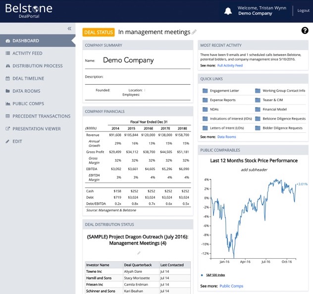 At Belstone, we believe that empowering our partners with transparency and context leads to better decisions. We've developed a proprietary suite of online software that allows you to track and analyze financial outcomes, deal process status, and granular diligence activity for each potential buyer or partner, all within a secure portal.